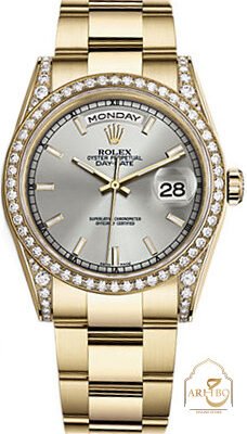Rolex Day-Date 36 Silver Dial Diamond Bezel Gold Watch 118388
