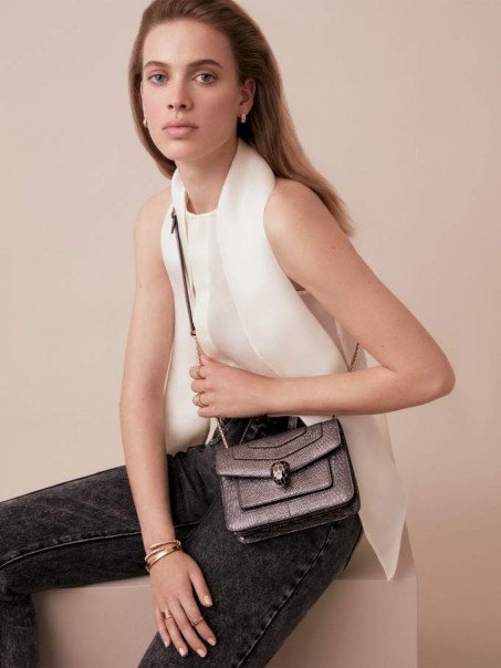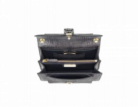 Marked by an urban lifestyle and a trendy wearability, the new “Serpenti Forever” crossbody bag brings a cool touch to the Serpenti universe. Crafted in precious metallic karung skin coloured in mint, this bag embodies the expertise of Bvlgari artisans in mastering precious materials to create timeless pieces. The iconic snakehead closure hypnotises with black and white enamel and seductive eyes in green malachite. Perfect to accessorise a fashion daywear look, the bag features a sinuous and adjustable snake body-shaped chain with a leather strap. Small size with two gussets, a small pocket mirror and an internal metal tag with the Bvlgari logo. One non-removable credit card holder, one open pocket, one zipped pocket and two external pockets complete this model. 19 x 13 x 7 cm – 7.5 x 5.1 x 2.8”