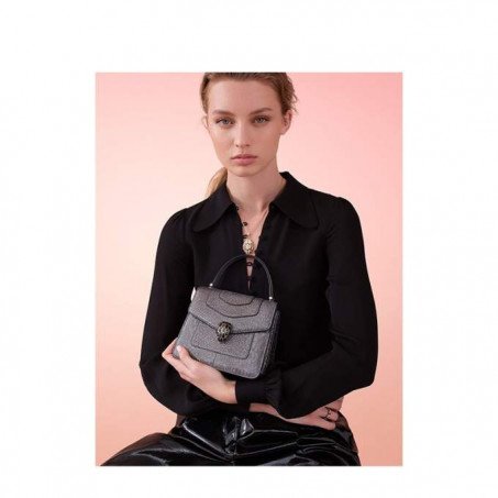 The Serpenti Forever slant is made of precious charcoal-diamond-colored water snakeskin with a metallic sheen that reflects Bulgari’s ability to use precious materials to create timeless works. Classic snakeshead ring with crystal charcoal diamond and shiny black enamel scales, snakeseye with black onyx. Handle style, 3 inner compartments, adjustable and detachable curved snake body tape, providing diversified use experience. Size S, with a makeup mirror inside. 18 x 15 x 9.5cm – 7.1 x 5.9 x 3.7 inches.