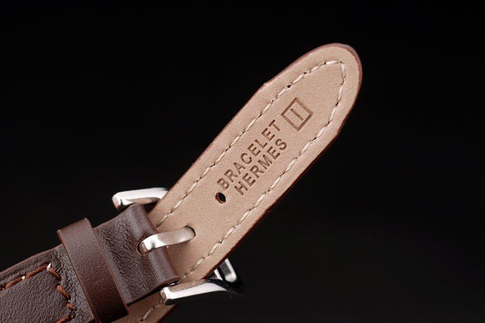 Bracelet: Elongated brown leather strap with heat embossed Bracelet Hermes Replica stamp and Hermes Replica engraved polished stainless steel hook-buckle clasp