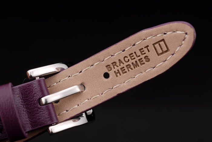 Bracelet: Elongated purple leather strap with heat embossed Bracelet Hermes Replica stamp and Hermes Replica engraved polished stainless steel hook-buckle clasp